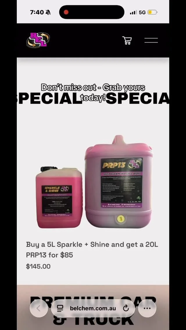 Washes Washes Clear Filters Filter Clear Filter 20L PRP13 + 1/2 Price Foam Cannon $147.50 Add To Cart Added! PRP13 from $20.00 Select Size 1L 5L 20L Add to Cart Added! Supa Wash from $12.00 Select Size 1L 5L 20L Add to Cart Added! Supa Truck Wash from $15.00 Select Size 1L 5L 20L Add to Cart Added! No results found No results match your search. Try removing a few filters. Have Questions?belchem@belw.net.au03836082002/2 Norwest AvenueLaverton North, VIC 3026